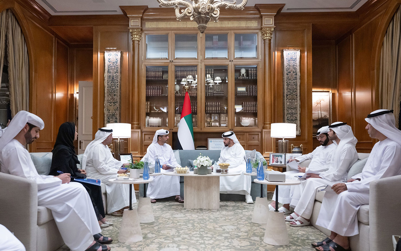 During the meeting, H.H. Sheikh Hamdan was briefed on the latest updates regarding the projects implemented by AD Ports Group to develop marine infrastructure and cruise ship facilities on Sir Bani Yas Island.
